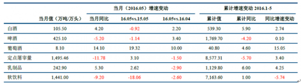 截至目前,除液體乳、速凍米面和醬油的產量數據更新至2015年10月外,其他主要品類產量數據已更新至2016年5月。從產量數據看,2015年1-10月,液體乳、速凍米面和醬油的產量均同比增長。2016年1-5月,食品制造業各主要子版塊產量變動分化明顯:白酒、乳制品、葡萄酒、軟飲料的產量同比增長,而啤酒產量和生豬定點屠宰量同比下降,其原因主要是生豬存欄量和出欄量同比下降以及豬肉價格大幅上漲影響部分需求。