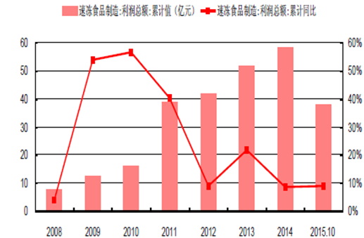 2008-2015年速凍食品利潤總額及增速