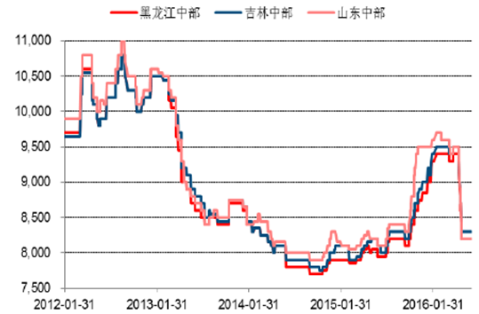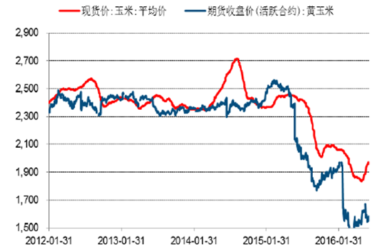 2012-2016年玉米現貨價及期貨價(元/噸)