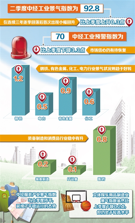 由經(jīng)濟(jì)日報(bào)社中經(jīng)趨勢研究院、國家統(tǒng)計(jì)局中國經(jīng)濟(jì)景氣監(jiān)測中心和中國社科院數(shù)量經(jīng)濟(jì)與技術(shù)經(jīng)濟(jì)研究所共同編制的2016年一季度中經(jīng)產(chǎn)業(yè)景氣指數(shù)7月28日發(fā)布。從2016年開始,中經(jīng)產(chǎn)業(yè)景氣指數(shù)采集的行業(yè)與以往略有不同,涵蓋了工業(yè)領(lǐng)域的重點(diǎn)產(chǎn)業(yè),包括裝備制造、煤炭、石油、電力、鋼鐵、有色金屬、化工、IT設(shè)備制造、醫(yī)藥、服裝、文體娛樂用品等。