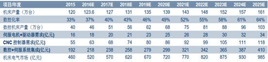 當前中國數控機床年產量約 40 萬臺。在提升數控率的規劃下,按整體機床市場每年增 長 3%的保守估計,到 2025 年數控機床年產量將翻一倍多達到百萬臺。相關的伺服產品市 場規模已接近 35 億元,CNC 控制器超百億,拉動的整體電氣市場更是接近千億。