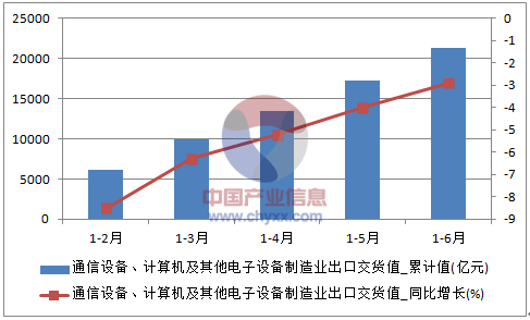 2016年1-6月中國通信設備、計算機及其他電子設備制造業出口交貨值統計數據