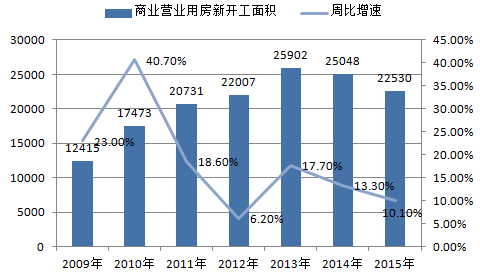2009-2015年全國商業營業用房新開工面積及其同比增速