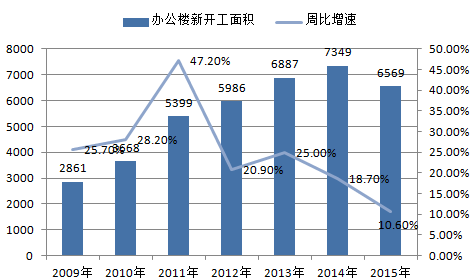 全國辦公樓市場供應減少,新開工面積同比近十年來首降。2009-2014年,全國辦公樓市場持續擴容,新開工面積年平均增長率達20.6%;2014年房地產行業步入調整期,辦公樓新開工面積同比增幅收窄,2015年,房企開發建設仍趨謹慎,辦公樓新開工面積同比轉增為降,降幅為10.6%,為近十年來首度同比下降。