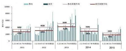 商辦用地供需創近五年新低,樓面均價同比上漲,溢價率較去年同期下降。2015年,全國300個主要城市商辦用地推出量為2.87億平方米,同比下降33.1%;成交量為2.20億平方米,同比下降35.1%;供需規模均降至近五年最低位。2015年,全國300個城市商辦用地成交樓面均價為1858元/平方米,同比上漲17.1%,溢價率為6.99%,較2014年同期下降2.93個百分點。