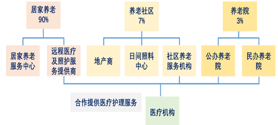 目前養老的主要模式包括居家養老、機構養老和社區養老,在我國居家養老占 據 96%,機構養老占據 3%,社區養老僅為 1%。居家養老,依托社區提供日常醫療 保健、文化娛樂、體育休閑、學習培訓、送餐、家政等服務。機構養老,則是老年人居住在特別的養老機構中,在我國養老機構種類繁多,包括普通型養老院、醫護 型養老院和敬老院。社區養老,則是由社會所提供的商業化的養老服務,通過社區服務設施,為半失能老年人為主的日托老年人提供日間服務,以及養老社區,比如 度假型養老社區。老年公寓則是居家養老和社區養老相結合而形成的養老地產。