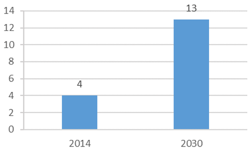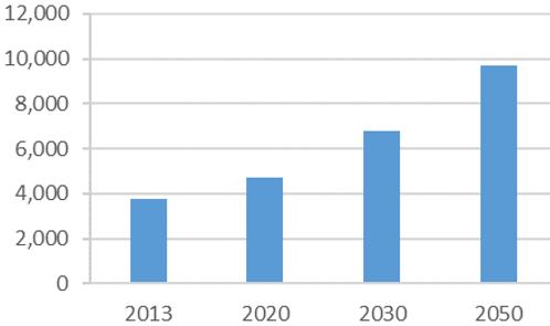 據中國老年產業發展報告預計,未來中 國失能老人人口將從 2013 年的 3,750 萬人,增長到 2020 年 4,700 萬人,2030 年 6,800 萬人以及 2050 年 9,700 萬人。其次,老年人口醫療衛生消費總量巨大。未來 40 年, 中國老年人的慢性病患者病例將從目前的 1.1 億例,增長到 2050 年的 36.8 億人次, 老年人口的醫療衛生消費占 GDP 的比重,將在 2050 年達到 5%以上,這說明針對 患有慢性疾病的老年人而開設的醫護型養老社區將會大有所為。