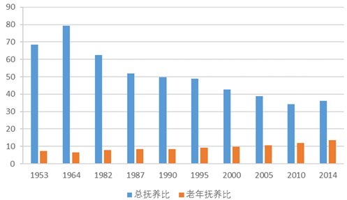 雖然我國總體撫養比呈現下降趨勢, 但是由于人口老齡化加劇,勞動力占比逐年走低,老年撫養呈遞增態勢,且增速不 斷加快。1953 年,我國老年撫養比僅為 7.40,而在 2000 年老人人口比為 9.90,在 2014 年已經上升至 13.70,增長速度正在不斷提高。根據《2012 年世界人口展望》 中所預測,2050 年和 2100 年我國的 60 歲以上人口撫養比將會高達 74.9%和 89.7%。 與此相對,由于眾多多年來實施計劃生育政策,截止 2015 年,中國大約有 1.5 億個 獨生子女家庭,“421”家庭數目激增。因此如何為老年人提供恰當的老年生活將是一 個亟待解決的問題。