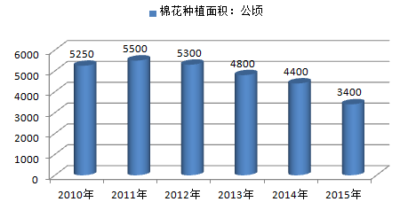 2015/16年度中國棉花播種面積3433千公頃,總產量520萬噸,單產每公頃1514公斤。受國內外價差縮小、關稅配額政策調整等因素影響,估計2015/16年度中國棉花進口量為92萬噸。2015/16年度棉花消費量估計為724萬噸,比上年度調減16萬噸。期末庫存降至1166萬噸,比上年度調減114萬噸。