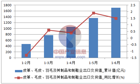 2016年1-6月中國皮革、毛皮、羽毛及其制品和制鞋業(yè)出口交貨值統(tǒng)計圖
