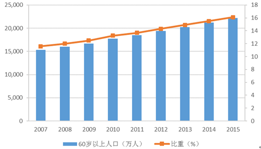 據統計,世界上發達國家諸如美國、英國、 新加坡和日本的老齡人口占比呈現增長趨勢,從 2010 年至 2015 年這五年間,此趨 勢尤為顯著。由此可見,老齡化已經是一個全球性問題。在我國,根據 2014 年和 2015年民政局發布的社會服務發展統計公告顯示, 60歲以上老年人口的數量在2007 年已達到 1.53 億人,占全國人口比重的 11.6%,截止 2015 年年底,我國 60 歲以上 老年人口為 2.22 億人,占全國總人口的 16.1%。根據中國老齡產業發展報告,中國 老齡化從 2013 年到 2021 年開始進入快速發展階段,將由 2.02 億人增加至 2.58 億 人,共增加 5,600 萬人,老齡化水平從 14.9%提高到 17.9%,進入輕度老齡化水平。 從 2022 年到 2030 年,中國老齡化進入急速發展階段,將由 2.58 億人增長到 3.71 億人,年均增長 1,260 萬人,進入中度老齡化水平。由此可見,未來我國人口老齡 化將十分迅猛,養老產業將成為我國未來經濟發展的新增長引擎。