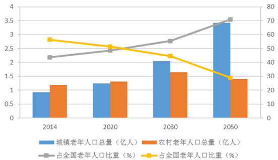 未來由于城鎮化進程快速推進,城市老年人口 將仍然保持增長,而農村老年人口則是先增后減,根據中國老齡產業發展報告顯示, 農村老齡人口變化的拐點將會在 2035 年左右。與此同時,在老年人口中女性比例 將會逐漸上升。在 2014 年,在老年人口中女性已超過男性,且在高齡段,該差距 愈發明顯。而到 2050 年,據估計,由于高齡老年人口的大幅增長,老年人口性別 比將會日益失衡,女性老年人口比男性老年人口多出 3,000 萬人。因此,未來養老 產業的局部應更多注重城市以及女性老年群體的需求。