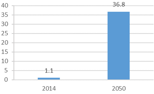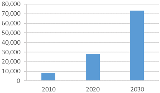 據中國老年產業發展報告預計,未來中 國失能老人人口將從 2013 年的 3,750 萬人,增長到 2020 年 4,700 萬人,2030 年 6,800 萬人以及 2050 年 9,700 萬人。其次,老年人口醫療衛生消費總量巨大。未來 40 年, 中國老年人的慢性病患者病例將從目前的 1.1 億例,增長到 2050 年的 36.8 億人次, 老年人口的醫療衛生消費占 GDP 的比重,將在 2050 年達到 5%以上,這說明針對 患有慢性疾病的老年人而開設的醫護型養老社區將會大有所為。