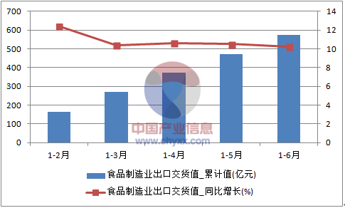 2016年1-6月中國食品制造業出口交貨值統計圖