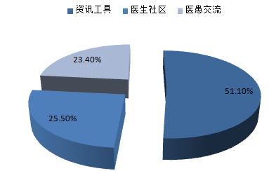 醫生社區類APP數量占比25.5%。該類型APP以醫生服務為中心,從醫生社區切入,各APP正在探索醫生需求市場價值的創新和延展。