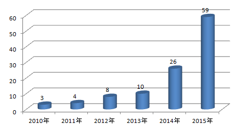 2010-2015年中國醫生端移動醫療市場融資次數(次)