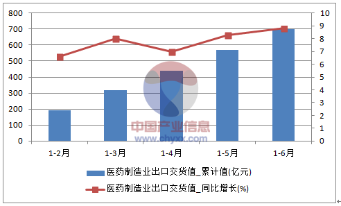 核心提示:智研咨詢數據顯示:2016年6月中國醫藥制造業出口交貨值134.6億元,同比增長12.2%;2016年1-6月中國醫藥制造業出口交貨值699.6億元,同比增長8.8%。 2016年1-6月中國醫藥制造業出口交貨值統計表 指標 醫藥制造業中經先略數據中心數據顯示:2016年6月中國醫藥制造業出口交貨值134.6億元,同比增長12.2%;2016年1-6月中國醫藥制造業出口交貨值699.6億元,同比增長8.8%。