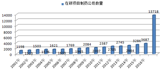2001-2016年全球制藥企業在研項目的制藥公司數量變華走勢