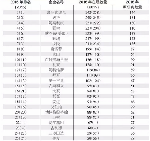 從2016年數據來看,排名居前五位的制藥公司分別為葛蘭素史克(GSK)、諾華(Novartis)、阿斯利康(AstraZeneca)、強生(Johnson & Johnson)和默沙東(Merck & Co.)。