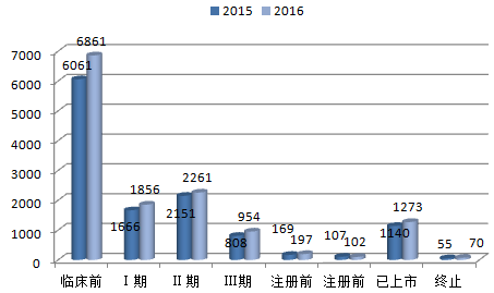通過對比2016年和2015年處于不同研發階段的在研藥物數量規模后不難發現,幾乎所有階段的在研藥物均出現了數量上的穩定增長。