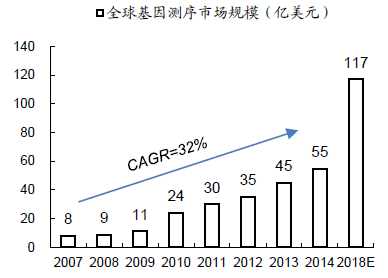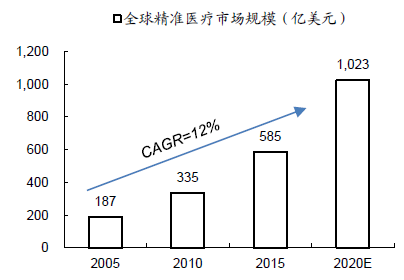 從2007年的7.94億美元增長到2014年的54.5億美元,年復合增速32%。據預測,2018年全球基因測序市場規模將達117億美元,未來四年年復合增速將達21%。全球精準醫療市場從2005年的187億美元增長到2015年的585億美元,年復合增速12%,預計2015-2020年全球精準醫療市場規模增速達15%,為醫藥行業增速的3-4倍,2020年全球精準醫療市場規模將達1023億美元。