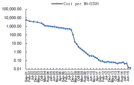 測序技術的提升,帶來測序成本的快速下降,其中2006年新一代測序技術的推出導致平均每兆數據量基因測序成本由2001年的5292美元下降到2015年的0.014美元,而2014年Illumina推出的HiSeqX Ten將單人類基因組測序成本降至1000美元以下,而原先啟動人類基因組計劃所需的成本是30億美元。
