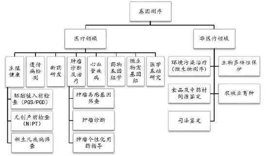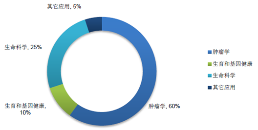 生育健康和腫瘤診斷治療是目前基因測序兩大主要應用領域。作為精準醫療范疇相對成熟的技術,基因測序目前的應用范圍較廣,醫療領域包括生育健康、遺傳病檢測、新藥研發、腫瘤診斷與治理、心血管疾病及醫學基礎研究,其中以生育健康和腫瘤診療、新藥研發和醫學基礎研究應用最多。無創產檢(NIPT)是目前產業化程度較高的領域,此外腫瘤領域市場空間巨大、處于飛速發展期。