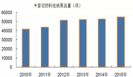 由國家科學技術獎勵工作辦公室編纂的《2015年全國科技成果統計年度報告》顯示,2015年全國登記的科技成果總量小幅增長。2015年全國共登記科技成果55284項,比上年增長4.03%。