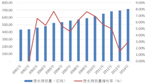2002 年-2014 全國廢水排放量及其增長率