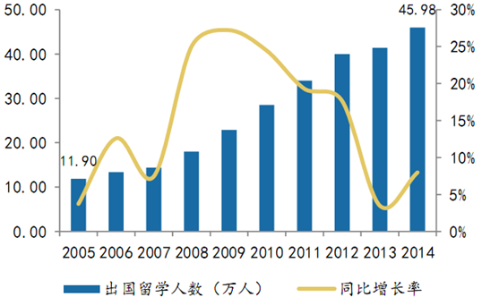 2014年度我國出國留學人員總數為45.98萬人,其中,自費留學42.30萬人,與2013年度的統計數據相比較,我國出國留學人數和留學回國人數均有增加。