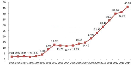 1995-2014年我國出國留學人員數量統計(單位:萬人)