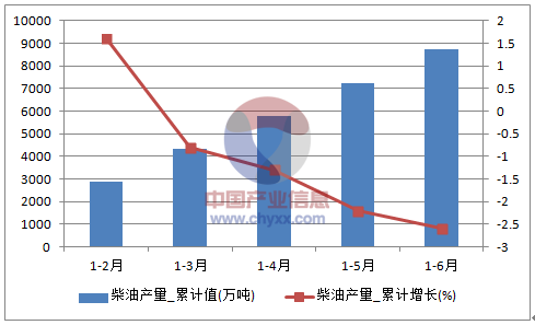2016年1-6月全國柴油產量統計圖