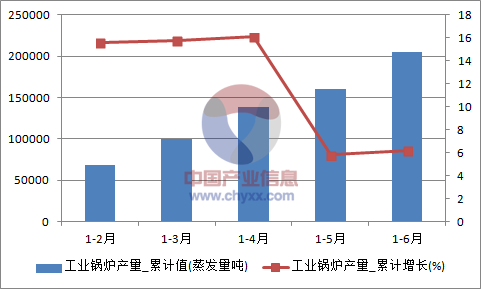 核心提示:智研咨詢數(shù)據(jù)顯示:2016年6月中國(guó)工業(yè)鍋爐產(chǎn)量為41493.2蒸發(fā)量噸,同比增長(zhǎng)0.2%。2016年1-6月止累計(jì)中國(guó)工業(yè)鍋爐產(chǎn)量204707.7蒸發(fā)量噸,同比增長(zhǎng)6.2%。2016年1-6月全國(guó)工業(yè)鍋爐產(chǎn)量數(shù)據(jù)表如下表所示:2016年1中經(jīng)先略數(shù)據(jù)中心數(shù)據(jù)顯示:2016年6月中國(guó)工業(yè)鍋爐產(chǎn)量為41493.2蒸發(fā)量噸,同比增長(zhǎng)0.2%。2016年1-6月止累計(jì)中國(guó)工業(yè)鍋爐產(chǎn)量204707.7蒸發(fā)量噸,同比增長(zhǎng)6.2%。2016年1-6月全國(guó)工業(yè)鍋爐產(chǎn)量數(shù)據(jù)表如下表所示: