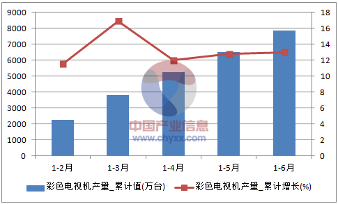 核心提示:智研咨詢數據顯示:2016年6月中國彩色電視機產量為1349.8萬臺,同比增長15.1%。2016年1-6月止累計中國彩色電視機產量7875.8萬臺,同比增長13%。2016年1-6月全國彩色電視機產量數據表如下表所示:2016年1-6月全中經先略數據中心數據顯示:2016年6月中國彩色電視機產量為1349.8萬臺,同比增長15.1%。2016年1-6月止累計中國彩色電視機產量7875.8萬臺,同比增長13%。2016年1-6月全國彩色電視機產量數據表如下表所示: