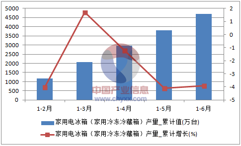 2016年1-6月全國家用電冰箱(家用冷凍冷藏箱)產量統計圖