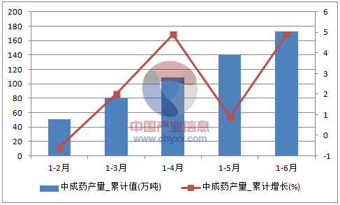 核心提示:智研咨詢數據顯示:2016年6月中國中成藥產量為33.2萬噸,同比增長6.4%。2016年1-6月止累計中國中成藥產量172.5萬噸,同比增長4.9%。2016年1-6月全國中成藥產量數據表如下表所示: 2016年1-6月全國中成藥產量統計中經先略數據中心數據顯示:2016年6月中國中成藥產量為33.2萬噸,同比增長6.4%。2016年1-6月止累計中國中成藥產量172.5萬噸,同比增長4.9%。2016年1-6月全國中成藥產量數據表如下表所示:2016年1-6月全國中成藥產量統計表月份中成藥產量_當期值(萬噸)中成藥產量_累計值(萬噸)中成藥產量_同比增長(%)中成藥產量_累計增長(%)2016年6月33.2172.56.44.92016年5月29.2139.84.70.92016年4月28.4109.244.92016年3月30.679.9722016年2月-50.7--0.6數據來源:國家統計局,中經先略數據中心整理2016年1-6月全國中成藥產量統計圖