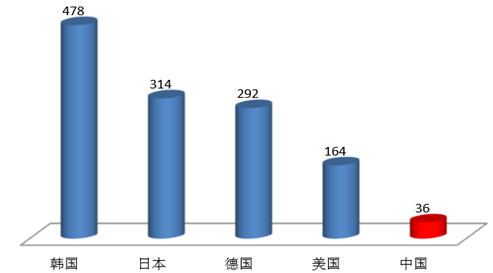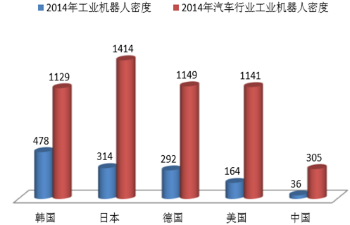 2014年我國工業機器人密度遠低于其他工業機器人大國