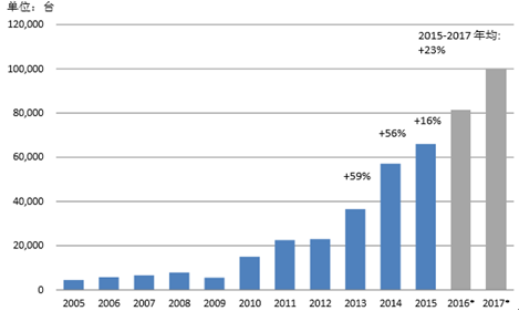 2005-2017我國工業機器人銷量及預測