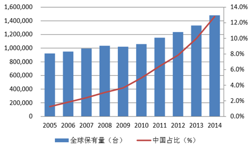 2005-2014 全球工業機器人保有量及中國占比