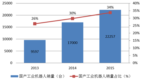 中國機器人產業聯盟(CRIA)數據顯示: 2013-2015 年我國自主品牌工業機器人銷量分別為 9600 臺、17000 臺和 22000 臺, 全國總銷量占比分別為 26%、30%和 34%,國產品牌已逐步打開市場。相較于國內工業機器人市場的整體增速,我國自主品牌工業機器人銷量的增速更為強 勁。2014-2015 年我國工業機器人市場整體增速分別為 56%、16%,國產品牌工業 機器人銷量增速分別為 78%、31%,增長勢頭明顯優于整體增速,且有進一步擴大 趨勢。