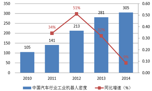 近年我國汽車行業工業機器人密度迅速提升