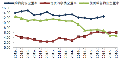 北上廣深主要商用地產空置率開始下降。2015 年至2016 年第1 季度,四地主要商用地產空置率有不同程度的下降,其中北京和廣州地區主要商用地產的空置率整體水平相對較高,大致在6%-12%之間,上海、深圳回暖的速度更為明顯,整體維持在6%-8%之間。