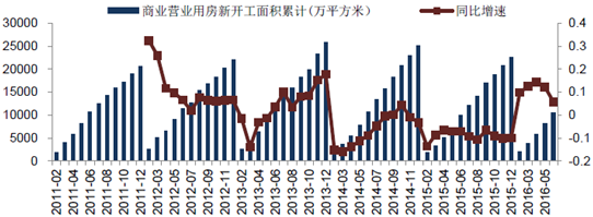 2011-2016年全國商業營業用房新開工面積累計及增速