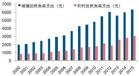 2000-2015年中國城鎮居民食品支出及農村居民食品支出