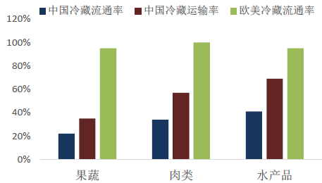 我國主要食品冷藏流通率、運輸率遠遠低于歐美國家,流通損腐率高。盡管近年來我國主要食品冷藏流通率及冷藏運輸率有明顯的提高,但整體水平仍遠遠低于歐美國家。根據中國物流與采購聯合會協會統計,2015 年我國果蔬、肉類、水產品的冷鏈流通率分別達到22%、34%、41%,冷藏運輸率分別為35%、57%、69%,而歐美國家基本都達到95%的水平。同時,由于行業規模尚未形成,標準及技術水平不一致,主要食品的流通損腐率較高,果蔬、肉類、水產品損腐率分別為25%、12%、15%,而歐美國家基本只保持在5%的損腐率。這表明,我國除了在絕對覆蓋面上的落后,技術及標準化水平也有較大的提升空間。