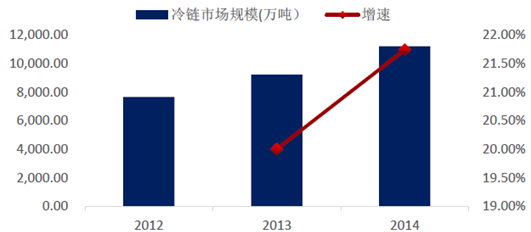 2012-2014年冷鏈市場規模(萬噸)及增速(%)