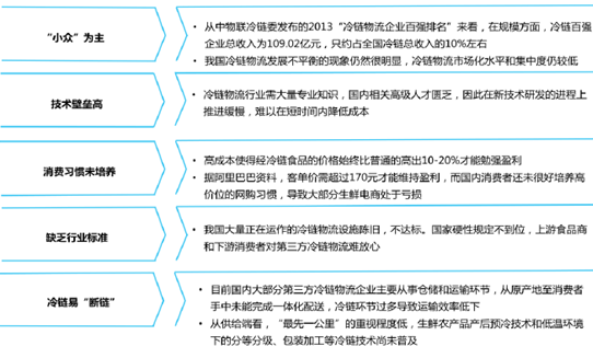 冷鏈行業(yè)依然供給不足,痛點多多。近年來,我國冷鏈物流的需求迅速增長,基礎設施也在不斷完善,冷鏈物流企業(yè)成長有目共睹。根據不完全統(tǒng)計,2015 年全國冷藏車預計增長14000 輛左右,冷藏車保有量突破9 萬輛,同比增長18.4%;全國冷庫新增390 萬噸,冷庫總保有量達到3710 萬噸,同比增長11.76%;果蔬、肉類、水產品的冷鏈流通率分別達到22%、34%、41%,冷藏運輸率分別為35%、57%、69%,各項指標都達到并超過國家制定目標。但就目前來看,整個行業(yè)還是存在著專業(yè)服務能力較弱、行業(yè)集中度不高、運輸效率低、冷鏈成本高、行業(yè)制度不完善等問題制約著冷鏈產業(yè)的發(fā)展。最近頻頻發(fā)生的食品安全事件疫苗安全事件,凸顯冷鏈物流環(huán)節(jié)的重要性,以及冷鏈行業(yè)當前存在的問題。