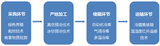 目前冷鏈物流應用最為廣泛的是食品運輸,一個合格的生鮮農產品冷鏈物流系統(tǒng),技術覆蓋需要從“最先一公里”的養(yǎng)殖和采摘,至“最后一公里”的運輸及銷售環(huán)節(jié)。