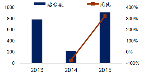 2015 年新開通地鐵車站259 站,地鐵車站累計達(dá)2257 座。根據(jù)中國軌道交通網(wǎng)統(tǒng)計,截止2014 年12 月31 日,共22 個城市建成投運城軌線路101 條,運營車站2027 座;截止2015 年12 月31 日,中國共有25 座城市開通運營軌道交通線路112 條,車站2257座。新開通線路11 條、新增運營334.68 公里、車站259 座,其中青島、南昌、淮安為首條線路開通運營。