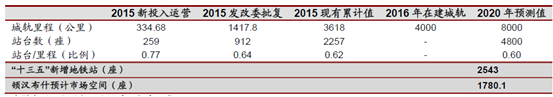“十三五”地鐵站臺數(shù)預(yù)計將翻倍,保守估計2020年地鐵站臺的累計量將達(dá)4800 座,則“十三五”新增地鐵站臺數(shù)合計2543 座,比2015年存量2257 座翻倍。